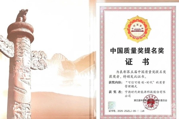 2025年9月16日,在中國質(zhì)量大會上,國家市場監(jiān)督管理總局正式頒發(fā)第五屆中國質(zhì)量獎,寧德時代憑借“可信可續(xù) 創(chuàng)·時代”質(zhì)量管理模式,榮獲中國質(zhì)量獎提名獎,成為歷年以來鋰電行業(yè)唯一獲獎企業(yè)。寧德時代質(zhì)量體系執(zhí)行總裁李偉出席并領(lǐng)獎。