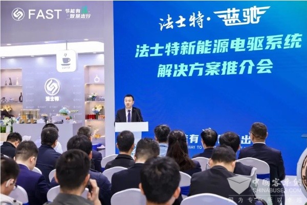 新能源產(chǎn)品在此次展出十分搶眼、備受關(guān)注。法士特副總經(jīng)理張海濤出席新能源電驅(qū)系統(tǒng)解決方案推介會(huì)并致辭。