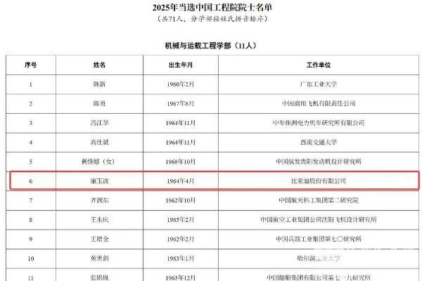 比亞迪廉玉波、寧德時(shí)代吳凱 汽車行業(yè)新增兩位院士!