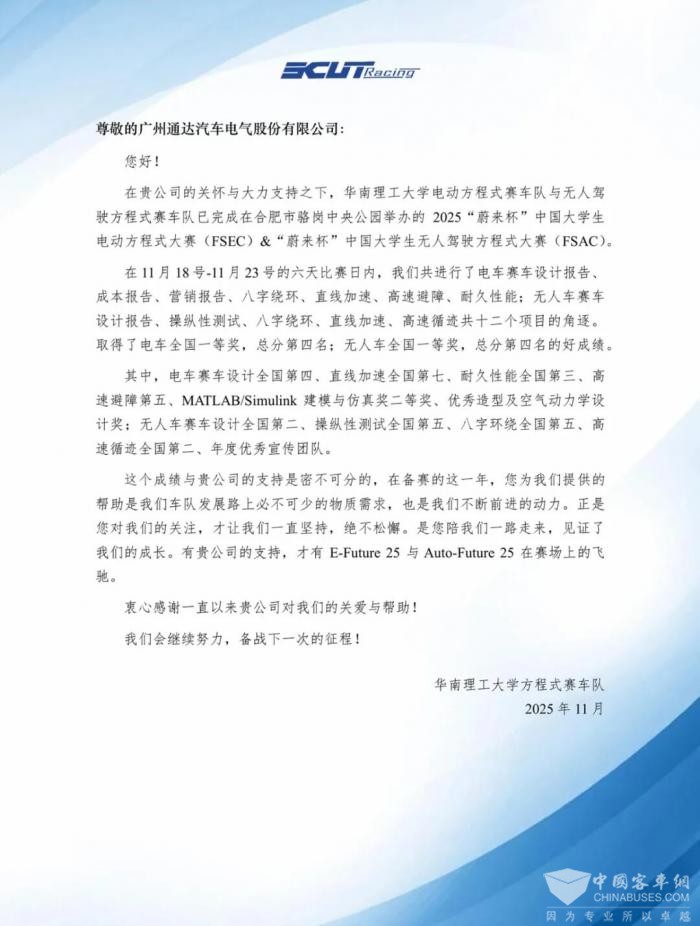 客車網(wǎng)2025年12月10日獲悉,華南理工大學(xué)方程式賽車隊(duì)在2025“蔚來(lái)杯”中國(guó)大學(xué)生電動(dòng)方程式大賽中斬獲多項(xiàng)全國(guó)大獎(jiǎng),并以一封真摯的感謝信,讓我們重溫了這段關(guān)于支持、成長(zhǎng)與共成長(zhǎng)的故事。