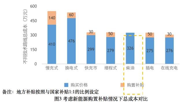 • 在考慮新能源車型目前所能獲得的購(gòu)置補(bǔ)貼情況下,慢充式和換電式純電動(dòng)兩種模式使用周期成本均高于柴油車,分別為410萬/輛和476萬/輛;