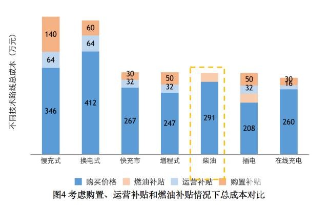 快充式純電動(dòng)、增程式、插電式混合動(dòng)力公交車與柴油公交車差距不大,基本一致,每輛車使用周期成本在325-329萬之間。