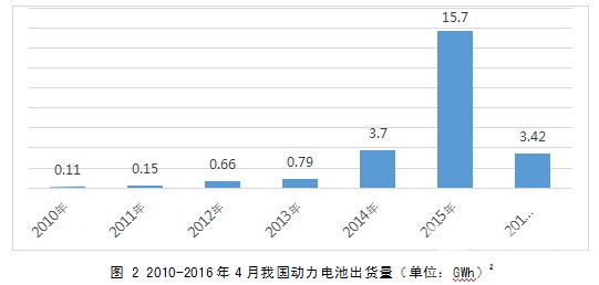 圖 2 2010-2016年4月我國(guó)動(dòng)力電池出貨量(單位:GWh) 3