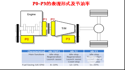 第二塊,目前電機(jī)混合動力可能有的幾種形態(tài),商用車我這里暫不去涉及,主要是乘用車這塊。這是一個(gè)典型的國內(nèi)已經(jīng)有批量在做的P2方案,這是P2的實(shí)現(xiàn)方案。P2的功率等級目前現(xiàn)狀從50-90千瓦。