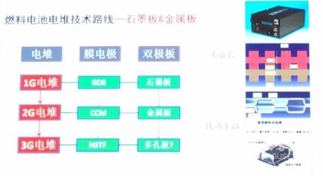燃料電池里最關(guān)鍵的零部件是燃料電池電堆,這由兩個東西組成,一個是膜電極、一個是金屬極板,這兩個東西拼在一起就是一個單電池,很多單電池串在一起成為一個電堆,發(fā)出所需要的功率。膜電極的發(fā)展方向已經(jīng)確定下來的,最早是GDE型的,把催化劑涂在碳紙上面然后再把膜電極壓好,第二代是CCM型的,把催化劑涂在膜上面然后壓好,現(xiàn)在開發(fā)的納米結(jié)構(gòu)的超薄的電機、有序的電機,這個電機還在開發(fā)之中,這三代是順著膜電極下來,這個大家已經(jīng)有共識了,我們中國非常幸運,2004年的時候科技部當(dāng)時支持我們做了CCM型膜電極,現(xiàn)在成為燃料電池車的標(biāo)配,這個大家都形成共識,對雙極板還有一點問題,這個最早大家都用石墨做雙極板,因為要導(dǎo)電還要耐腐蝕,石墨材料比較好,現(xiàn)在為了提高功率密度就用金屬板。
