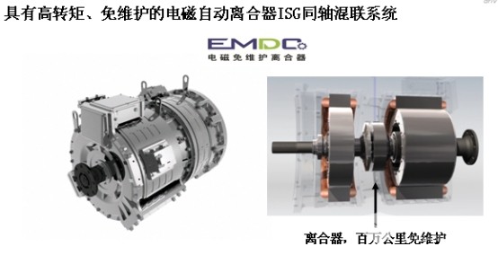 我們公司的戰(zhàn)略就是持續(xù)推動技術(shù)進步,打造世界領(lǐng)先的新能源商用車電動系統(tǒng)。直驅(qū)電機的進步差不多了,我們最關(guān)鍵的是要突破離合器和少檔位變速器的產(chǎn)品瓶頸,構(gòu)建電機加傳動的優(yōu)勢產(chǎn)品。變速器并不是檔位越多越難做,在電動領(lǐng)域,實際上檔位越少越難做,因為換擋的級差很大。舉一個例子,首先在離合方面,精進電動的第一代ISG混聯(lián)產(chǎn)品,在油耗、可靠性方面絕對是行業(yè)標桿,終端客戶非常忠誠。我們在在2014年、2015年第一代系統(tǒng)里采用氣動電控干式離合器。我們經(jīng)過四年的研發(fā),已經(jīng)徹底淘汰了氣動干式離合器,實現(xiàn)了電磁離合器,百萬公里免維護,已經(jīng)推廣了上千套,甚至我們的客戶前幾批車直接開到拉薩去,翻過唐古拉山口(海拔五千多米)。這個離合器最根本的特點就是通過創(chuàng)新性的電磁設(shè)計,實現(xiàn)了在干式條件下,金屬對金屬的嚙合,同時實現(xiàn)無縫的全同步的接合,沒有磨損,這樣就給客戶帶來了百萬公里免維護的優(yōu)點:一滴油不用加,一次箱子不用搭,一次離合器不用換,一只氣缸都不會壞,給客戶帶來百萬公里免維護的優(yōu)勢。這個技術(shù)同時我們的總成帶來了總尺寸縮短,重量降低的好處。另外兩個很重要的優(yōu)點,首先當我們維護量少的時候,我們給客戶節(jié)省了維護變速箱、離合器的費用,每年大概6000到10000元。同時,以往的干式離合器是不防水的,因為有通風、排塵各方面的要求;我們的新型離合器也做到了取消在動力總成里面所有的漏水點,使混動完全可以實現(xiàn)浸水運行。
