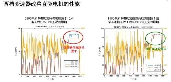 剛才我講到直驅(qū)技術(shù)的局限,我們在這里看到的是一個典型的2800N·m的電機,在滿足13%~15%的基本爬坡度要求,在12米客車上,如果要跑90km以上的續(xù)駛高速,即使在C-WTVC的工況下,很難實現(xiàn)工況的跟隨,也就是在這個地方滿足不了車速的要求。