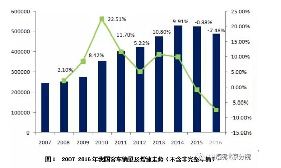 2016年,我國客車市場延續(xù)了上一年同比負增長的特征,且降幅呈擴大趨勢。從近十年客車市場銷量增速走勢來看,基本呈現(xiàn)5年一個發(fā)展周期的特征。2008-2012年、2012-2016年相繼出現(xiàn)了高速增長、平緩調(diào)整的兩個振蕩周期。但是整體來看,我國客車市場持續(xù)低迷,企業(yè)生存壓力劇增,發(fā)展形勢極為嚴峻。