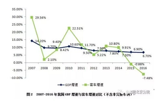 首先,客車市場的下滑與宏觀經(jīng)濟環(huán)境增速放緩緊密相關(guān)。2007年和2010年,我國GDP增速分別為14.20%、10.60%,與之相對應(yīng)的,我國客車市場同年增速均達到峰值。隨著GDP增速逐漸放緩,我國經(jīng)濟步入新常態(tài),我國客車市場也迎來小幅調(diào)整時期。2015、2016年,中國GDP增速正式進入“6”時代,我國客車市場隨之出現(xiàn)負增長趨勢。