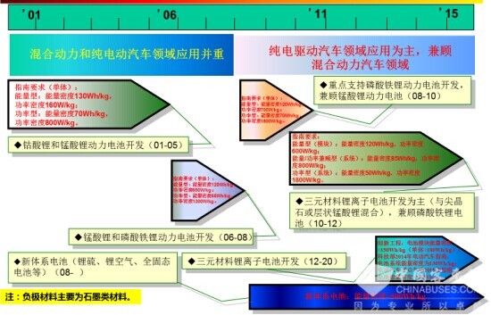 再看一下中國(guó)政府的三個(gè)五年計(jì)劃以來(lái)動(dòng)力電池技術(shù)路線的變化,主要是鋰離子電池的發(fā)展變化情況,從它的應(yīng)用領(lǐng)域來(lái)看,還是跟國(guó)家對(duì)電動(dòng)汽車技術(shù)支持的轉(zhuǎn)變是密切相關(guān)的,原來(lái)是混合動(dòng)力和純電動(dòng)并重,現(xiàn)在以純電驅(qū)動(dòng)作為戰(zhàn)略取向,從大的角度看混合動(dòng)力汽車也包括在內(nèi)。