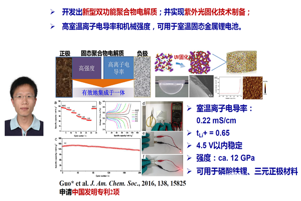 在固態(tài)電池開(kāi)發(fā)方面,5個(gè)團(tuán)隊(duì)取得了進(jìn)展?;瘜W(xué)所的郭玉國(guó)團(tuán)隊(duì)開(kāi)發(fā)了聚(醚-丙烯酸酯)的聚合物固體電解質(zhì),耐受氧化電壓是4.5伏。