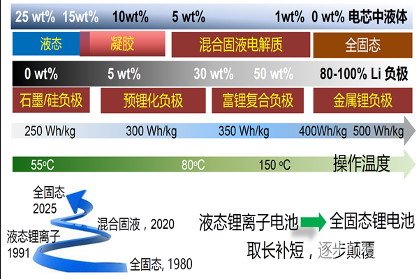 目前開(kāi)發(fā)生產(chǎn)的液態(tài)電解質(zhì)鋰離子電池的軟包電芯中,一般液體電解質(zhì)重量百分比為20-25%,負(fù)極為碳、硅等。從長(zhǎng)遠(yuǎn)看,未來(lái)需要發(fā)展全固態(tài)金屬鋰電池,負(fù)極全部為鋰,但面臨很大的挑戰(zhàn)。在未來(lái)短期和中期,介于全固態(tài)和液態(tài)電解質(zhì)鋰離子電池之間的技術(shù),如混合固液電解質(zhì)電池,可能會(huì)在提升能量密度的同時(shí),兼顧安全性、倍率特性、循環(huán)性,首先實(shí)現(xiàn)商業(yè)化。