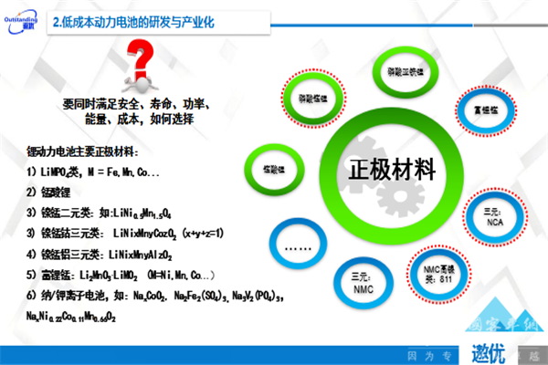 磷酸鐵鋰電池從安全、技術(shù)方面都相當(dāng)成熟,三元材料這兩年進(jìn)步也非常大,循環(huán)壽命作到從十年前的500次到現(xiàn)在超過兩千次以上,錳酸鋰有成本優(yōu)勢(shì),但是目前做磷酸鐵鋰的動(dòng)力電池廠家在這方面的研發(fā)還不夠,富鋰錳也是同樣狀況,希望今年電池廠家能夠小批量將富鋰錳產(chǎn)業(yè)化,能看到希望的就是這個(gè)材料,而不是虧本做生意。碳酸鋰價(jià)格高,碳酸鉀碳酸鈉卻非常便宜,也就為碳酸鋰1/10的價(jià)格,如能取代碳酸鋰將使成本大幅下降。磷酸錳鋰的材料到目前做的不錯(cuò),但是現(xiàn)在量比較少,需要更多的磷酸鐵鋰材料廠參與這方面的研發(fā)工作。市場(chǎng)上主要的正極材料如圖所示:
