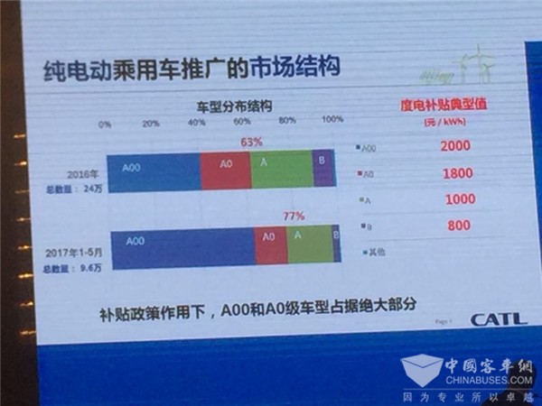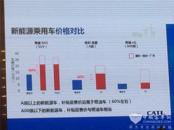 下面還有一個東西說明問題,這是一個計算,你的A00級實際上按照續(xù)駛里程補了2千塊錢,可能超過電池成本了,但是對A級、B級車補貼只有1千或者8百,我們必須客觀承認,我們現(xiàn)在的市場還是在靠國家政策推動下的一個市場。