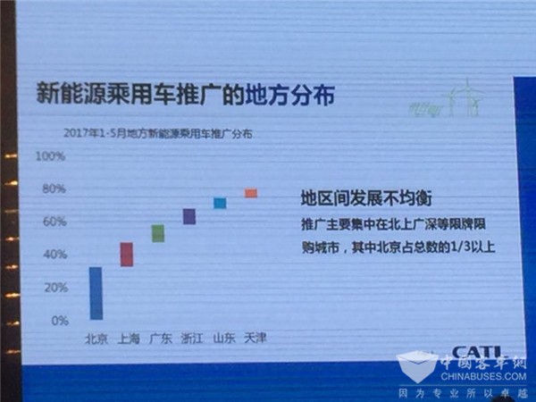 還有一個問題,地區(qū)間的發(fā)展不均衡,我們現(xiàn)在主要的乘用車推廣集中在北上廣深這些具有限牌的城市。其中北京占總數(shù)的三分之一。還有一個數(shù)字更不好看,乘用車的7萬輛里面,真正私人購車的只有1萬多輛。為什么?我想這肯定是一個原因,即充電設(shè)施。