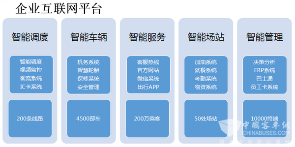 多年來,青島公交集團(tuán)積極探索企業(yè)智能化管理架構(gòu),成立城市公共交通發(fā)展研究院,規(guī)劃推動企業(yè)信息化智能化建設(shè)和管理。先后實(shí)施了智能調(diào)度、視頻監(jiān)控、IC卡收費(fèi)、OA辦公、ERP管理(營運(yùn)、機(jī)務(wù)、保修、人力資源、物資供應(yīng)、預(yù)算、計劃生育、安全、工會、企業(yè)管理、服務(wù)、稽查、基建等模塊)、統(tǒng)計系統(tǒng)、決策分析、客服熱線、收銀系統(tǒng)、就餐系統(tǒng)、加油系統(tǒng)、職工卡管理、輪胎管理、考勤、微信、網(wǎng)站、視頻會議系統(tǒng)、巴士通、智能出行APP等30多個應(yīng)用系統(tǒng)或模塊,建立起包含30個應(yīng)用系統(tǒng)的龐大的智能管理“云”平臺。集團(tuán)互聯(lián)網(wǎng)應(yīng)用覆蓋60處場站、1000多臺PC、5000多套車載設(shè)備、10000多臺手機(jī)?,F(xiàn)已基本形成“智能調(diào)度、智能車輛、智能場站、智能服務(wù)和智能管理”五大體系,全面支撐 “互聯(lián)網(wǎng)+青島公交”戰(zhàn)略,促進(jìn)互聯(lián)網(wǎng)技術(shù)與企業(yè)經(jīng)營管理各板塊加速融合,以互聯(lián)網(wǎng)引領(lǐng)企業(yè)轉(zhuǎn)型升級、創(chuàng)新發(fā)展。