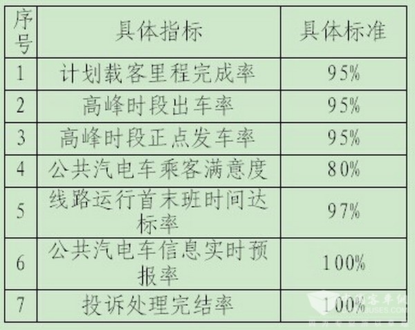 公交企業(yè)運(yùn)營服務(wù)質(zhì)量考核績效由“數(shù)量考核”與“質(zhì)量考核”組成。日??己藘蓚€月進(jìn)行一次,其中數(shù)量指標(biāo)包括高峰時段出車率、高峰時段正點(diǎn)發(fā)車率兩項(xiàng)指標(biāo);質(zhì)量指標(biāo)包括服務(wù)設(shè)施完備率、運(yùn)營服務(wù)合格率、車輛整潔合格率、公交企業(yè)駕駛員工資實(shí)發(fā)率、公交企業(yè)駕駛員實(shí)際配置率等五項(xiàng)指標(biāo)。年度考核指標(biāo)包括數(shù)量指標(biāo)和質(zhì)量指標(biāo)。其中,年度考核數(shù)量指標(biāo)包括計劃載客里程完成率、高峰時段出車率、高峰時段正點(diǎn)發(fā)車率等三項(xiàng)指標(biāo);年度考核質(zhì)量指標(biāo)包括線路運(yùn)行首末班時間達(dá)標(biāo)率、公交車輛中途故障率、公共汽電車責(zé)任事故死亡率、公共汽電車責(zé)任事故率、公共汽電車信息實(shí)時預(yù)報率、投訴案件數(shù)占運(yùn)營里程比率、投訴處理完結(jié)率、車載智能終端使用率、企業(yè)基礎(chǔ)管理等九項(xiàng)指標(biāo)。