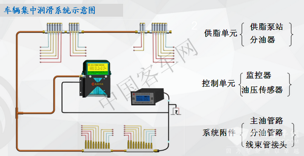 車輛集中潤(rùn)滑系統(tǒng)各部分功能示意: