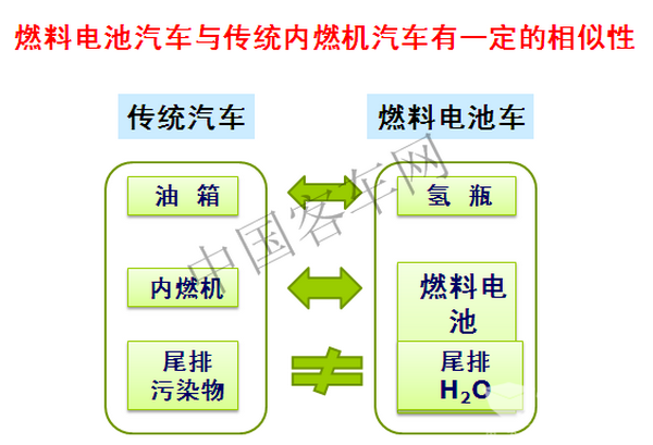 衣寶廉在接受客車網(wǎng)采訪時,指出燃料電池汽車在結(jié)構(gòu)和性能方面,與傳統(tǒng)內(nèi)燃機汽車有一定的相似性,但兩者相比的優(yōu)越性在于,傳統(tǒng)汽車排放是含有污染物的尾氣,而燃料電池汽車排放的是氫氧結(jié)合物——水(H2O)。