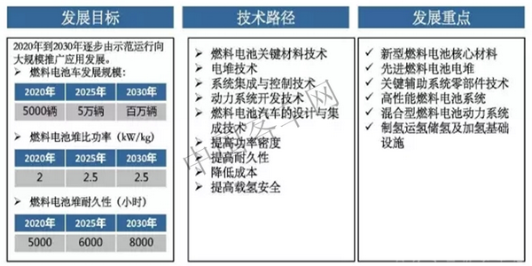 2017年,工業(yè)和信息化部、國家發(fā)展和改革委員會、科學(xué)技術(shù)部聯(lián)合印發(fā)《汽車產(chǎn)業(yè)中長期發(fā)展規(guī)劃》,燃料電池技術(shù)發(fā)展路線以2020年、2025年及2030年為三個關(guān)鍵時間節(jié)點,依據(jù)產(chǎn)品研發(fā)-制造驗證-批量應(yīng)用的規(guī)劃思路,使車用燃料電池電堆的性能、壽命、成本三個關(guān)鍵指標依次達到商業(yè)化要求,并且完成電堆及關(guān)鍵材料的批量制造能力建設(shè),滿足燃料電池汽車發(fā)展需求。