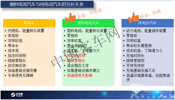 如上圖所見,根據(jù)各自的技術(shù)特色,在實際應(yīng)用當(dāng)中,氫燃料電池汽車和電動車是一種優(yōu)勢互補關(guān)系。
