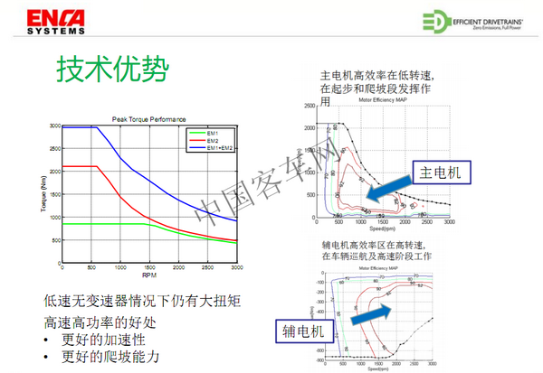 茵卡動(dòng)力通過2016年的合資,把這項(xiàng)專利技術(shù)引進(jìn)到中國,首先在中國的公交客車行業(yè)推廣,并且取得了非常大的進(jìn)步。這項(xiàng)專利技術(shù)核心的部分就是雙電機(jī)雙離合器的混合動(dòng)力系統(tǒng),顧名思義系統(tǒng)是由兩個(gè)電機(jī)和兩個(gè)離合器集成的,EDI和茵卡動(dòng)力分別擁有這項(xiàng)技術(shù)在美國和中國的專利權(quán)。它的基本的工作邏輯就是在開始的時(shí)候由主電機(jī)以純電動(dòng)模式來驅(qū)動(dòng)車輛,當(dāng)車輛都達(dá)到一定車速的時(shí)候,發(fā)動(dòng)機(jī)啟動(dòng)并直接驅(qū)動(dòng)車輛。輔助電機(jī)的主要作用有三個(gè),一是起動(dòng)發(fā)動(dòng)機(jī),二是發(fā)電,再一個(gè)就是可以單獨(dú)的或者配合發(fā)動(dòng)機(jī)或主電機(jī)一起驅(qū)動(dòng)車輛。專利技術(shù)的特點(diǎn)是這兩個(gè)電機(jī)由兩個(gè)離合器來連接,所以說這兩個(gè)電機(jī)輸出扭矩可以相互疊加,特別是在一些特殊的工況,需要大扭矩輸出的情況下,這個(gè)系統(tǒng)就可以打開發(fā)動(dòng)機(jī)端的離合器,閉合雙電機(jī)之間的離合器,從而提供兩個(gè)電機(jī)疊加在一起的更大的扭矩輸出,可以達(dá)到更高的爬坡性能要求。