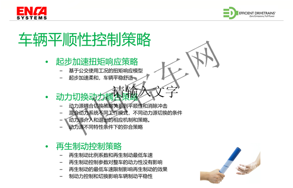 我們知道電機(jī)跟發(fā)動(dòng)機(jī)的扭矩特性是完全不一樣的,使用電機(jī)驅(qū)動(dòng)必須對(duì)扭矩進(jìn)行限制,從而讓扭矩輸出符合公交的工況。另外一個(gè)就是動(dòng)力耦合的切換,就是在切換的時(shí)候,如果控制不好就會(huì)有沖擊,就會(huì)有震動(dòng),就會(huì)造成部件損壞,如何讓第一個(gè)動(dòng)力源來逐漸的退出,讓第二個(gè)動(dòng)力源來逐漸的介入,中間平順的過渡,這個(gè)是非常關(guān)鍵的。另外一個(gè)就是制動(dòng)控制策略,制動(dòng)沖擊的消除都是通過控制操作來實(shí)現(xiàn)。