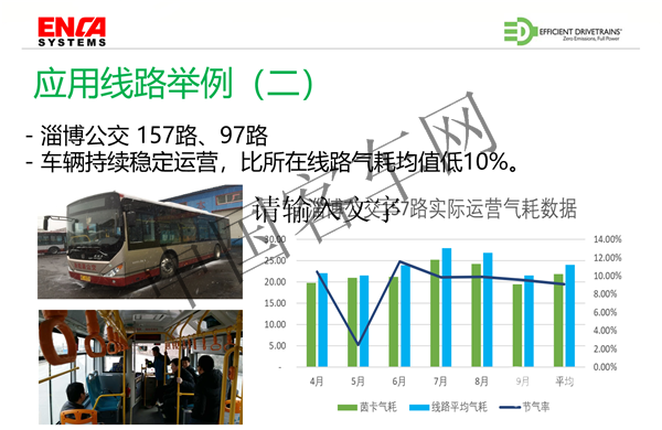我們從去年開始在國內(nèi)開始進(jìn)行推廣應(yīng)用,在向濟(jì)南、萬州一些公交公司來提供我們的樣車,讓客戶體驗(yàn)這個(gè)技術(shù),我們已經(jīng)批量在許多公交運(yùn)營(yíng)使用。下面舉一下應(yīng)用的案例:一個(gè)是在陜西銅川的,這就是用的最早的一個(gè)案例,2015年開始到現(xiàn)在20萬公里,不插電的情況下,氣耗節(jié)省30%;二是在山東淄博的這兩條線路,平順性和節(jié)能率都得到用戶的肯定;三是西安公交,根據(jù)客戶的要求,我們跟長(zhǎng)安大學(xué)合作對(duì)原有車輛進(jìn)行技術(shù)革新,我們的雙離合系統(tǒng)滿足了他們對(duì)車輛爬坡性能的要求;四是我們跟安凱客車合作四川、重慶等地進(jìn)行坡道線路的展示運(yùn)營(yíng),因?yàn)樗拇ā⒅貞c地區(qū)對(duì)車輛爬坡要求性能要求比較高,展示運(yùn)營(yíng)目前已經(jīng)超過5000公里,已經(jīng)得到了當(dāng)?shù)剀囍髋c駕駛員的一致認(rèn)可,取得了很好的效果,該展示運(yùn)營(yíng)還將持續(xù)在其他山區(qū)城市進(jìn)行。