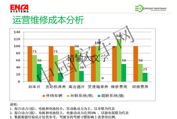 以上是關(guān)于我們專利的雙離合系統(tǒng)技術(shù)的一個(gè)介紹,因?yàn)檫@次會(huì)議主題是關(guān)于成本,所以我想花一點(diǎn)時(shí)間來介紹一下,公交運(yùn)營(yíng)成本跟混合動(dòng)力系統(tǒng)的聯(lián)系。首先來看一個(gè)我們實(shí)際應(yīng)用的案例,保守估計(jì),混合動(dòng)力在不插電的情況下可以實(shí)現(xiàn)節(jié)油30%,以這個(gè)數(shù)據(jù)來計(jì)算,根據(jù)車輛的使用壽命、行駛里程、燃油/氣的價(jià)格來計(jì)算,混合動(dòng)力車輛全生命周期內(nèi)可以節(jié)省燃料的費(fèi)用大概在32萬到35萬之間,這個(gè)結(jié)果是一個(gè)估算,當(dāng)然每個(gè)地方不一樣,可能有差別。另外一個(gè)就是除了燃料消耗的節(jié)省之外,還有運(yùn)營(yíng)維修的成本,這也是很大的一塊。我不知道大家有沒有注意到,比如說剎車片,因?yàn)榛旌蟿?dòng)力加入了電機(jī)反拖制動(dòng),對(duì)剎車片的使用和磨耗將明顯減少,因此它的更換會(huì)少,發(fā)動(dòng)機(jī)的保養(yǎng)也是同樣的情況,因?yàn)榘l(fā)動(dòng)機(jī)的使用間隔會(huì)明顯增大,使用的頻率會(huì)少。對(duì)于離合器片來說,由于離合器結(jié)合和分離的執(zhí)行動(dòng)作是由電腦程序來控制,離合器的結(jié)合和分離時(shí)相對(duì)滑動(dòng)幾乎沒有,所以之后離合器的磨損很少。由于沒有變速箱,所以變速箱的保養(yǎng)費(fèi)用為零。另外,柔和及精確的控制大大提升了車輛的平順性,使得傳動(dòng)系統(tǒng)的沖擊很小,部件的損壞就會(huì)少,維修成本就會(huì)更低。