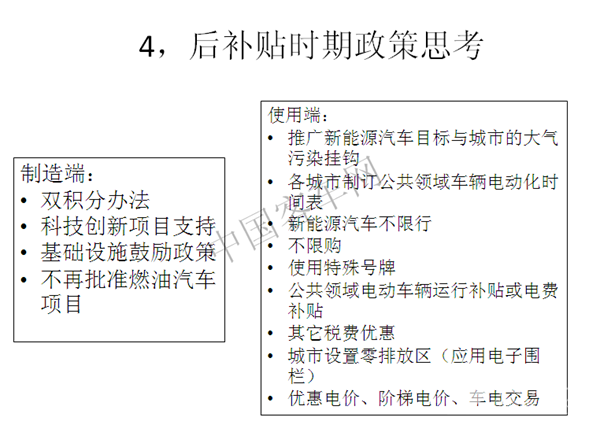 對后補貼時期的政策,正在開展研究與制訂過程,我這里列出來一些。首先是在制造端,大家知道最重要的是雙積分辦法,目前跟客車沒有直接關(guān)系。前幾天在討論后補貼政策的時候,大家談到商用車這塊也要考慮制定類似雙積分的辦法??蛙噺S也必須完成一定數(shù)量的新能源汽車的生產(chǎn)和銷售。除了制造端以外,還要在使用端加大推動力度。前面已經(jīng)講了藍天保衛(wèi)戰(zhàn)的重要任務,客車行業(yè)扮演著重要的角色,我們要把推廣新能源汽車的目標跟城市大氣污染治理緊密掛鉤,各個城市下一步要制定公共領(lǐng)域車輛電動化的時間表。我認為禁止燃油時間表,我們不急著訂,但是公交車電動化,公共領(lǐng)域汽車電動化,需要制訂時間表。此外還有新能源汽車不限行,不限購,特殊號牌等鼓勵新能源汽車使用的政策。這樣的話,我相信在補貼退出以后,新能源汽車仍然有強有力的政策支持并且持續(xù)的發(fā)展。