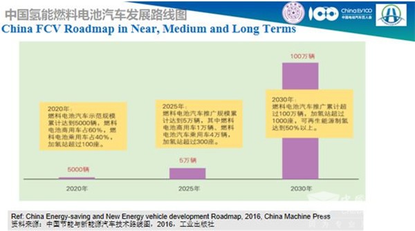 王賀武的解釋是路線圖分為近、中、遠(yuǎn)三期:近期到2020年時(shí),中國將運(yùn)行5,000輛FCV(實(shí)際已經(jīng)超過6000輛),并在高效制氫、儲(chǔ)存、運(yùn)輸、分配以及加氫站等技術(shù)上有突破;中期目標(biāo)是在2025年時(shí),實(shí)現(xiàn)10000輛商用車和40000輛乘用車的運(yùn)行;而遠(yuǎn)期目標(biāo)是到2030年時(shí),完成100萬輛FCV的運(yùn)行,其氫氣來源50%將來自于可再生能源制氫,此外還將運(yùn)營超過1000個(gè)加氫站,以保障氫能燃料電池汽車的正常行駛。