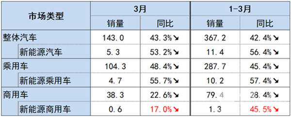 據(jù)中國汽車工業(yè)協(xié)會統(tǒng)計(表1),今年1-3月,我國新能源汽車銷量11.4萬輛,同比下降56.4%,其中新能源乘用車下滑57.4%,新能源商用車下滑45.5%。但就3月而言,新能源汽車銷量5.3萬輛,其中乘用車銷售4.7萬輛,商用車銷量0.6萬輛,同比下降17%。與整體汽車市場及其他細分市場相比較,新能源商用車3月對比整體Q1降幅急劇收窄,成為整個汽車市場上反彈力度最大者。這表明,新能源商用車市場出現(xiàn)了較大的復蘇跡象。