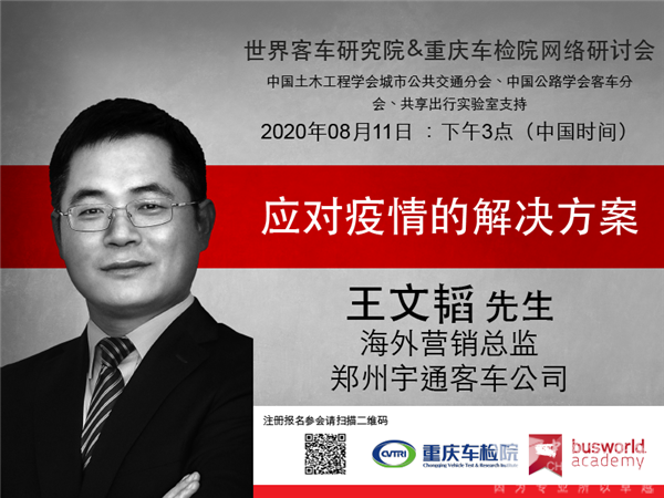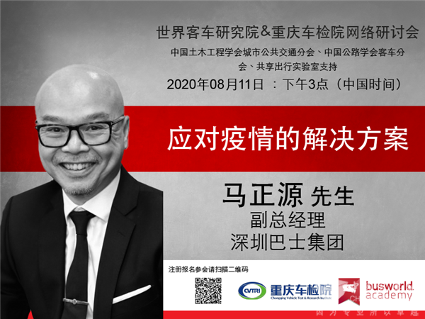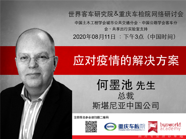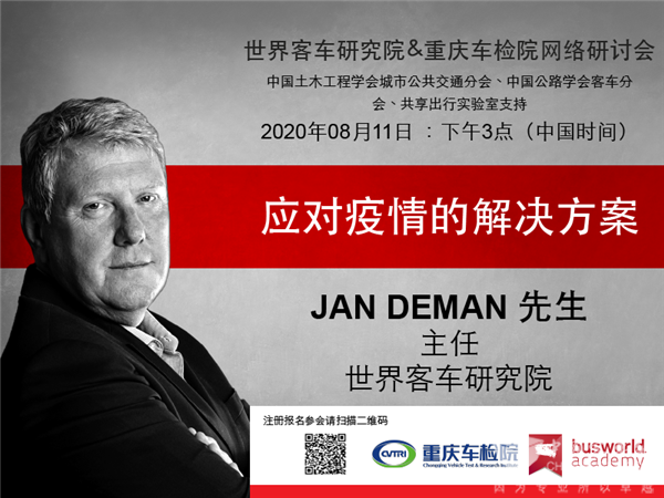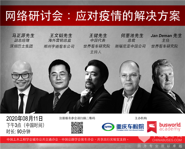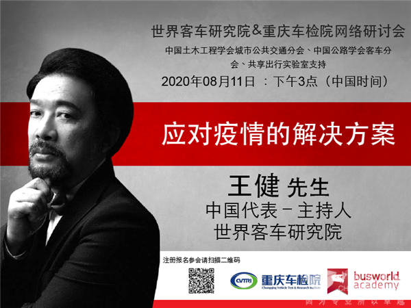 為了共同探討客車行業(yè)應(yīng)對(duì)疫情的策略和未來(lái)發(fā)展之路,由重慶車檢院和世界客車研究院(Busworld Academy) 主辦,中國(guó)土木工程學(xué)會(huì)城市公共交通分會(huì)、中國(guó)公路學(xué)會(huì)客車分會(huì)、共享出行實(shí)驗(yàn)室支持的國(guó)際網(wǎng)絡(luò)研討會(huì):“應(yīng)對(duì)疫情的解決方案”,將于2020年8月11日下午15:00-17:00正式舉辦。