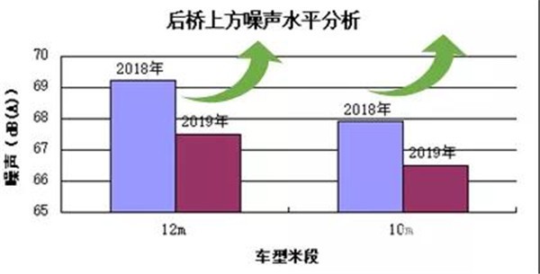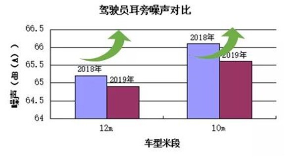 在舒適性方面,最難改善的NVH性能,各車型也改善明顯,12 m段車型駕駛員耳旁噪聲平均成績(jī)提高近0.5%,后橋上方噪聲平均成績(jī)提高近2.5%;11 m段車型駕駛員耳旁噪聲平均成績(jī)提高近0.8%,后橋上方噪聲平均成績(jī)提高近2.1%,如圖所示。