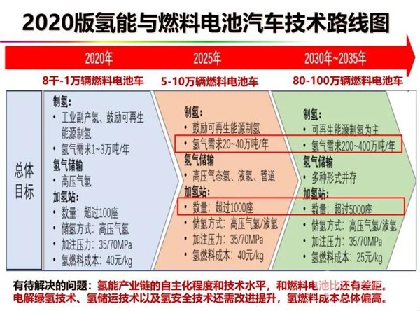 往前看氫能燃料電池的技術(shù)路線圖。2025年目標(biāo)是推廣5-10萬氫燃料電池車;2030-2035年實(shí)現(xiàn)80-100萬輛應(yīng)用規(guī)模,這都是以商用車為主體。在這個(gè)情況下,氫需求量到2030年大概三百萬噸左右,這個(gè)可能比我們預(yù)期的低。這還是按商用車為主體預(yù)測(cè)的,如果主要是轎車,幾十萬噸就夠了。但加氫站的數(shù)量可能比我們想象的要多。因?yàn)榧託湫时燃犹烊粴庖?,氫是最輕的一種氣體,只是天然氣密度的1/8。當(dāng)前氫燃料電池汽車發(fā)展還面臨一些挑戰(zhàn),比如說氫燃料產(chǎn)業(yè)鏈自主化程度與技術(shù)水平和燃料電池還有差距,電解綠氫技術(shù)、氫儲(chǔ)運(yùn)技術(shù)、氫安全技術(shù)還需要改進(jìn)提升,氫燃料的成本總體偏高,這是今后5-10年必須努力解決的。