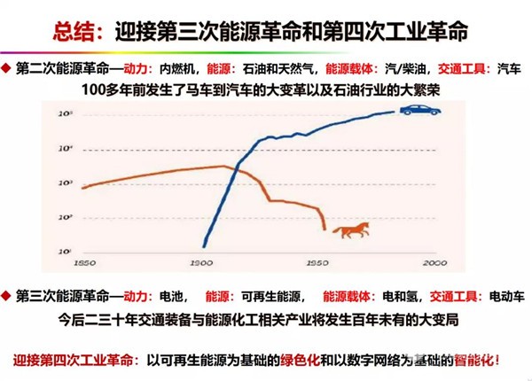 最后我做一個(gè)總結(jié)——迎接第三次能源革命和第四次工業(yè)革命。一百多年前的第二次能源革命引發(fā)了馬車到汽車的大轉(zhuǎn)型和石油行業(yè)的大繁榮。主要的轉(zhuǎn)型期從1900年開始,大概經(jīng)歷了25年左右。現(xiàn)在第三次能源革命就在眼前。我估計(jì)與上次馬車到汽車的轉(zhuǎn)變類似,今后二三十年交通裝備與能源化工相關(guān)產(chǎn)業(yè)將發(fā)生百年未有之大變局。讓我們共同迎接第四次工業(yè)革命,也就是以可再生能源為基礎(chǔ)的綠色化和以數(shù)字網(wǎng)絡(luò)為基礎(chǔ)的智能化。