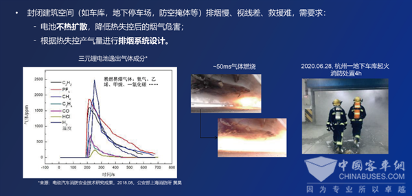 針對新能源汽車的安全問題——現(xiàn)在生活中越來越多的封閉建筑空間,如車庫、地下停車場、防空掩體等,這些封閉空間排煙慢、視線差、救援難度大,對電池系統(tǒng)安全性也提出了更高的要求。