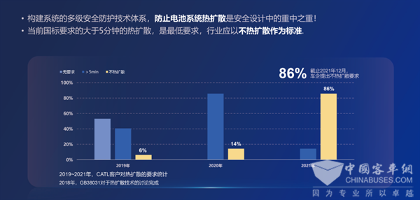 可以看到,2019年有一半的客戶對熱擴(kuò)散沒有要求;2020年有超過80%的客戶要求和國標(biāo)一致,即熱擴(kuò)散時間不小于5分鐘即可,還有14%的客戶要求系統(tǒng)不發(fā)生熱擴(kuò)散;2021年客戶的安全要求有了徹底改變,已有86%的客戶要求電池包不發(fā)生熱擴(kuò)散。寧德時代的客戶基本覆蓋了國內(nèi)外絕大部分車企,這說明不熱擴(kuò)散已經(jīng)成為車企對電池系統(tǒng)安全性的普遍要求。