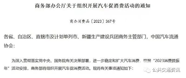 近日,商務部辦公廳發(fā)布關(guān)于組織開展汽車促消費活動的通知,以穩(wěn)定和擴大汽車消費。商務部將親自組織開展汽車促消費活動,活動時間為2023年6月至12月。《通知》提到,結(jié)合“2023消費提振年”工作安排,統(tǒng)籌開展“百城聯(lián)動”汽車節(jié)和“千縣萬鎮(zhèn)”新能源汽車消費季活動。