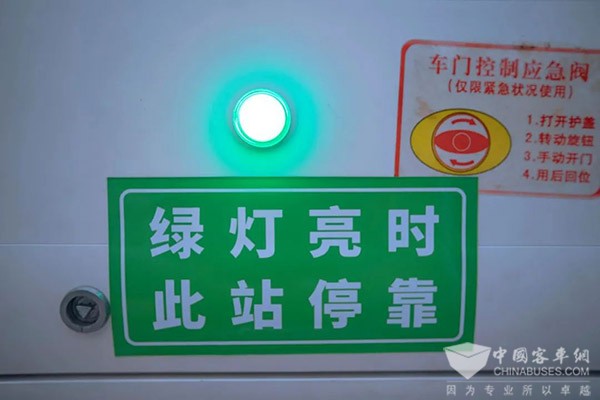 按鈴就亮燈。車內(nèi)配有提示綠燈,下方貼有“綠燈亮時,此站???rdquo;的標識;