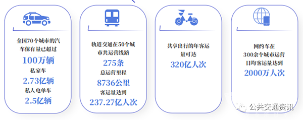 私家車、電單車、軌道交通、共享單車和網(wǎng)約車等多種出行方式不斷分流城市公交客流量。據(jù)統(tǒng)計,截至2022年底,全國70個城市的汽車保有量已超過100萬輛,私家車2.73億輛,私人電單車2.5億輛;軌道交通(地鐵)在50個城市共運營線路275條,總運營里程8736公里,客運量達到237.27億人次;共享出行的年客運量可達320億人次;網(wǎng)約車在300余個城市運營,日均客運量達到2000萬人次。