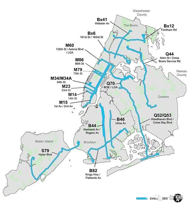 就在國內(nèi)對BRT系統(tǒng)(含公交專用道)不太感冒的時候(核心是路權(quán)問題),紐約卻因為沒錢修地鐵,設(shè)置了17條快速公交走廊串聯(lián)核心地區(qū),運營20條線路,日均客流達(dá)到34萬人次。