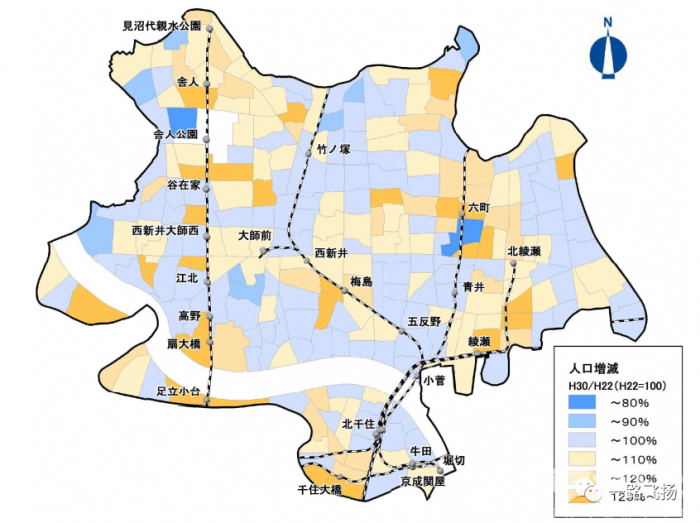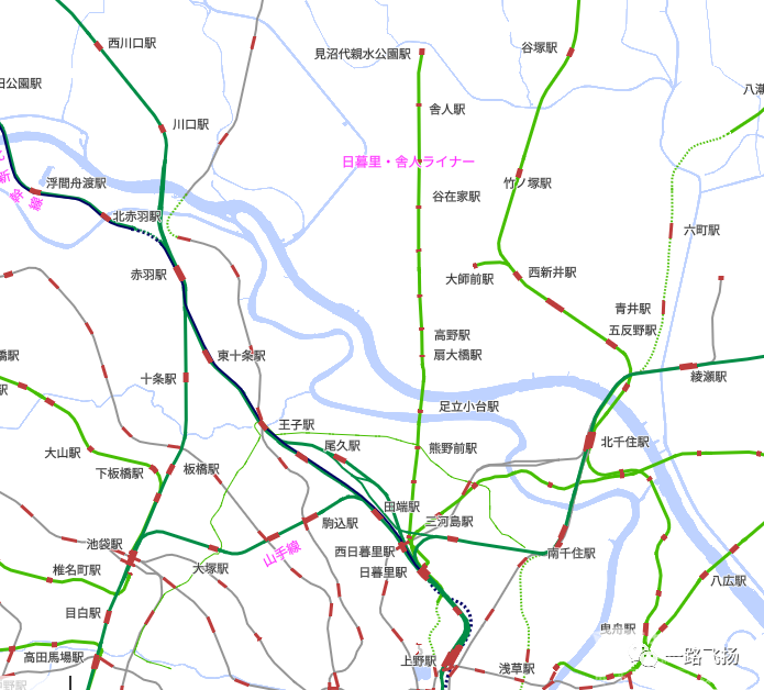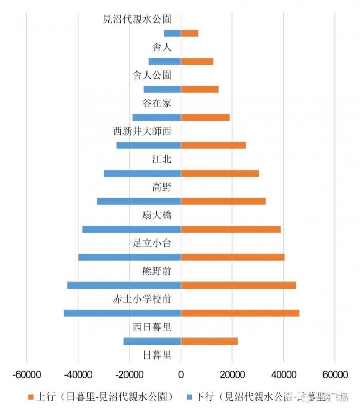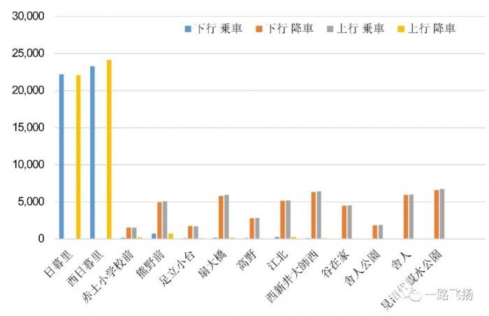日暮里舍人線線路圖東京都足立區(qū)人口變化荒川北岸日暮里舍人線跨越東京都道58號和首都高速路日暮里舍人線全日斷面客流分布日暮里舍人線全日站點乘降量分布