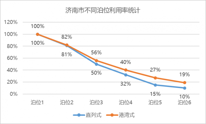 (1)建議單組站臺的設計泊位數(shù)不宜超過3個。根據(jù)對濟南市站臺泊位的利用率分析,3個以上泊位的利用率不高,從第4個泊位開始,泊位通行能力下降至50%以下。