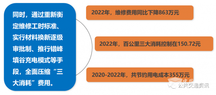 三是堅持目標導(dǎo)向,優(yōu)化成本管控指標。我們通過搭建主動安全預(yù)警系統(tǒng)、構(gòu)建雙重預(yù)防機制、職工心理健康培訓(xùn)等舉措,全面夯實安全管理基礎(chǔ)。2022年,萬公里事故成本和百萬公里事故起數(shù)控制在158.22元和0.73起,并實現(xiàn)了“零亡人、零群傷”的局面。同時,通過重新衡定維修工時標準、實行材料換新逐級審批制、推行錯峰填谷充電模式等手段,全面壓縮“三大消耗”費用。2022年,維修費用同比下降863萬元,百公里三大消耗控制在150.72元;2020-2022年,共節(jié)約用電成本355萬元。