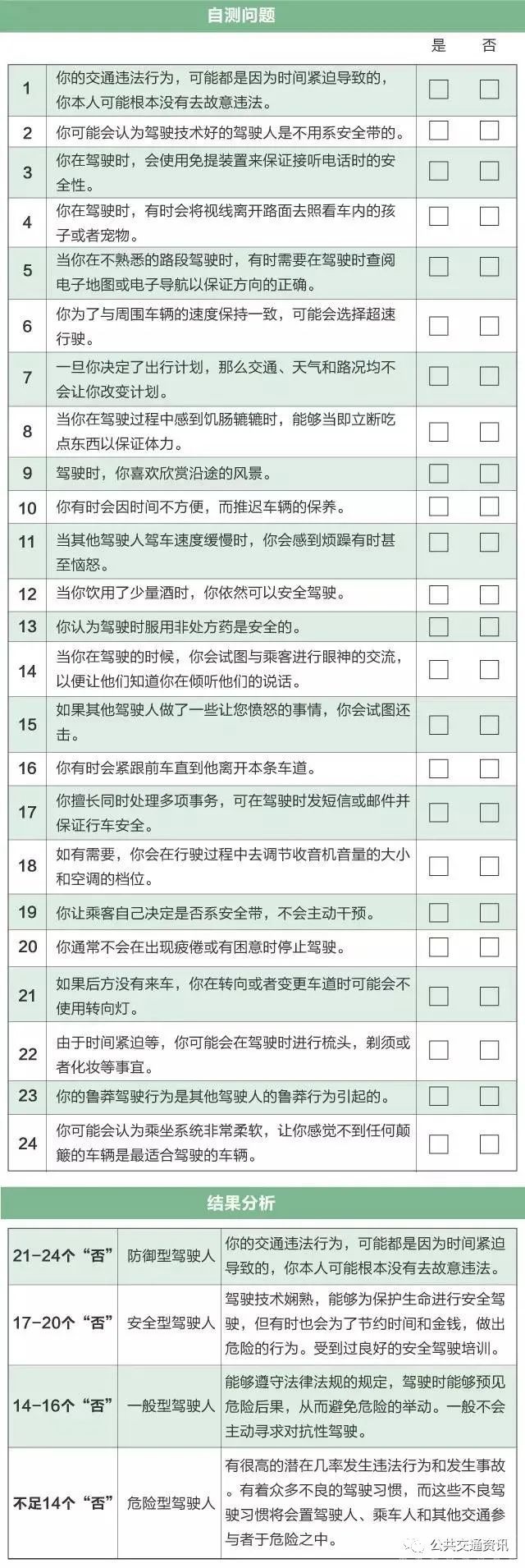 上面的題目中,選擇“否”的個(gè)數(shù)越多,你的安全駕駛水平就越高,當(dāng)你有超過20道題都選了“否”,那么恭喜你,你就是一名典型的防御型駕駛員。