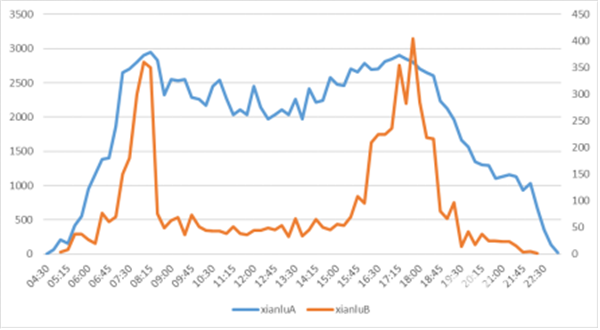 跨線運(yùn)營是在將某一條線路上某一時(shí)段閑置的車輛投放于另一條線路進(jìn)行運(yùn)營。(2)案例應(yīng)用 在實(shí)際運(yùn)營中需要充分分析線路的客流時(shí)間分布,來確定哪些時(shí)段可用于跨線調(diào)度。下圖為線路A與線路B的客流時(shí)間分布圖。線路A除早晚低峰,其余時(shí)段客流均處于較高水平,而線路B在平峰及低峰期間客流減少明顯,為提高線路A的服務(wù)水平及保障線路A車輛加油(氣)等,就可以將平峰期間線路B的部分車輛跨線運(yùn)營于線路A,提高線路B車輛的利用率。
