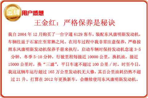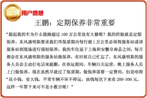 C:走合行駛里程達到1500~2500公里或20~50小時,憑東風(fēng)康明斯發(fā)動機有限公司《質(zhì)量保證手冊》、購車發(fā)票以及發(fā)動機(或整車)合格證到東風(fēng)康明斯發(fā)動機有限公司所屬或委托服務(wù)站進行新機檢查保養(yǎng),這種檢查保養(yǎng)是免費的。