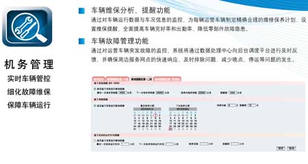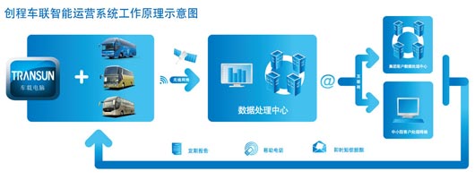 工作原理:“創(chuàng)程車聯(lián)”智能運營系統(tǒng)通過車載智能終端從CAN總線、各類傳感器上持續(xù)不斷的采集發(fā)動機(jī)運行數(shù)據(jù)、車輛狀況信息、駕駛員的操控行為,同時接收GPS衛(wèi)星定位信息記錄車輛所在位置,所有這些信息通過無線通訊實時傳遞到數(shù)據(jù)處理中心。數(shù)據(jù)處理中心通過商業(yè)智能技術(shù)將接收到的海量數(shù)據(jù)實時分析、整理,并以直觀的報告、圖表等形式展現(xiàn)出來??蛻襞c集團(tuán)調(diào)度中心即可使用獨立賬號從互聯(lián)網(wǎng)在任何地方訪問“創(chuàng)程車聯(lián)”智能運營系統(tǒng),及時了解車輛運行情況,從而制定相應(yīng)的策略,更可隨時向前段運營車輛發(fā)送各類指令,進(jìn)行實時的調(diào)度管控。