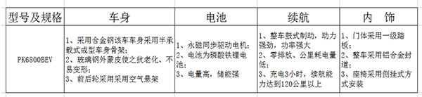 參數(shù)配置 PK6800BEV 公交客車 8050mm 2420mm 3060,3220mm 8235kg 12050kg 56/10-27 69km/h TZ400XS200 90kw 江西特種電機(jī)股份有限公司 承載式車身 1300/2150mm 2+2空氣懸架 -/- 2 4600mm 3895/8155kg 11/9° 6 245/70R19.5 1.可外接充電; ,2.儲能裝置的種類/型號/生產(chǎn)企業(yè):鋰離子蓄電池/IFP66/182/295/中鹽安徽紅四方鋰電有限公司; ,3.產(chǎn)品技術(shù)階段:發(fā)展期; ,4.該車應(yīng)安裝廣州科密汽車電子控制技術(shù)股份有限公司的CM4XL-4S/4M型ABS系統(tǒng)控制器; ,5.電機(jī)的額定功率為90kW,峰值功率為180kW. ,6.可取消空調(diào),也可選裝內(nèi)置頂置空調(diào),取消空調(diào)或選裝內(nèi)置頂置空調(diào)時的車高為3060mm.